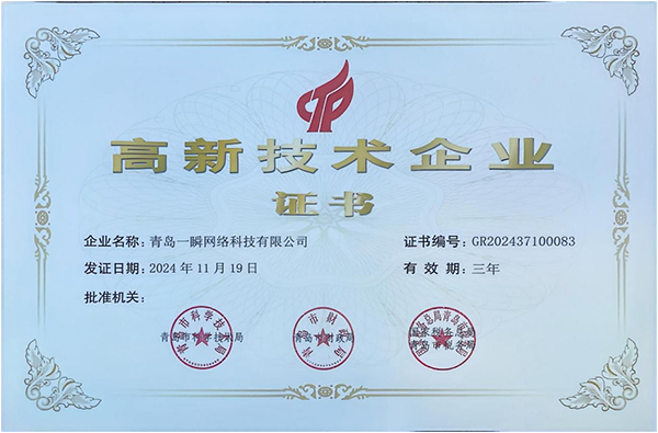 新年迎喜報,攜手攬榮光。青島一瞬網(wǎng)絡科技有限公司(以下簡稱“一瞬網(wǎng)絡”)再次通過國家級“高新技術企業(yè)認定”!這是繼2018年以來,我司連續(xù)三次榮獲該項殊榮!